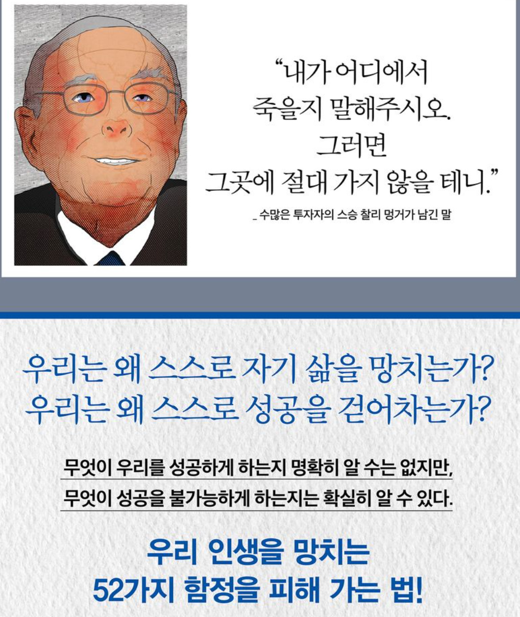 이 책은 이렇게 관점을 뒤집는 방식으로 우리의 잘못된 삶의 방식을 돌아보게 만든다. 그러면서 불행한 길, 안 되는 길을 피해 가도록 도움을 준다. 경각심을 갖도록 살짝 강경한 어조를 사용하면서도 절대 위트를 잊지 않는다. 글의 핵심을 강렬하게 전달해 주는 일러스트도 함께 실어 보는 재미도 살렸다. 하지만 여기서 끝나면 이 책이 의미 없을 터. ‘조용한 이성의 목소리’란 정리를 통해 왜 우리가 그런 삶의 방식과 태도를 피해야 하는지 조곤조곤 살펴준다. 더 늦기 전에 인생을 바로 잡고 싶다면 이 책이 분명 도움이 될 것이다.