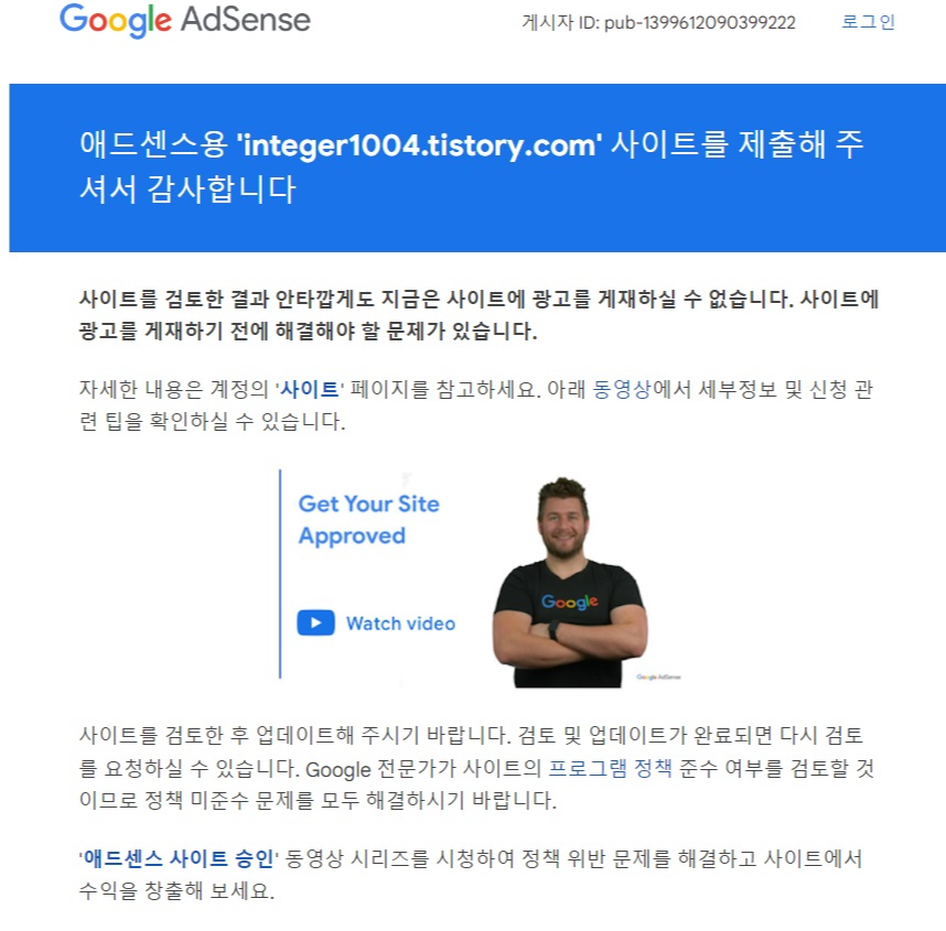 작은이야기 AdSense 정말 어렵다.. by integer1004 2023. 11. 16. 벌써 3번째 사이트를 검토한 결과 안타깝게도 지금은 사이트에 광고를 게재할수 없습니다.. 라는 구글 메일 도착 저 사진속 아저씨 또 보네... 애드센스 사이트 승인 정말 어렵다.. 도대체 뭐가 잘못 되어서. 승인이 안 떨어지는 걸까.. 에이... 안해... 애드센스 안해... 광고로 수익이 생기면 좋지만... 구글 승인이 이렇게 어려워서야 이쯤에서 애드 센스는 포기... 공유하기 게시글 관리 작은이야기 저작자표시 비영리 변경금지 (새창열림) '작은이야기' 카테고리의 다른 글 나들이 (53) 2023.11.19 토요일 (70) 2023.11.18 사라진 컴퓨터 유물 (114) 2023.11.16 20년전 인터넷 (64) 2023.11.16 입주 6년차 (97) 2023.11.16 관련글 나들이 토요일 사라진 컴퓨터 유물 20년전 인터넷