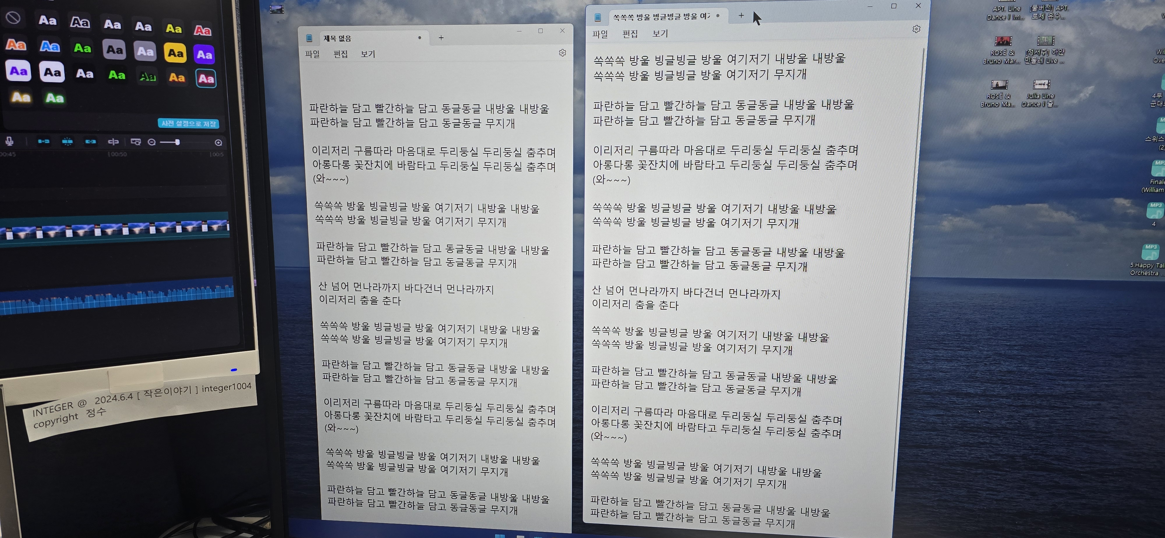 메모장에서 원하는 영상의 가사부분을 같이 보면서